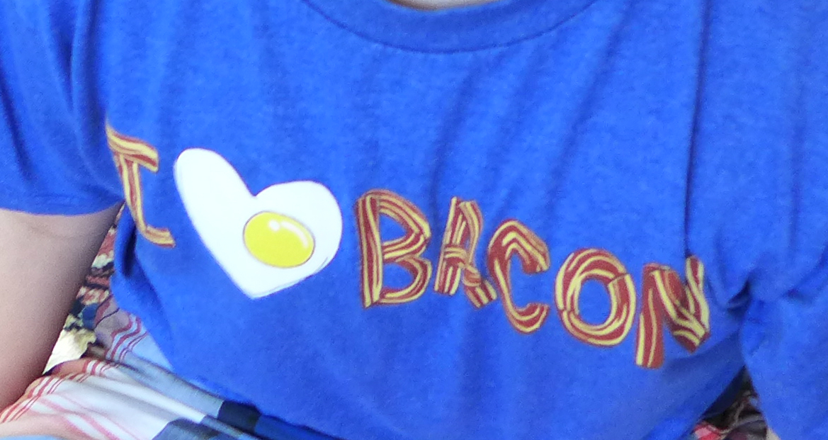 Today that baby turns 12 years old. He has a big heart and an old soul. He’s kind, considerate, and full of hugs. He is cautious and smart, clever and funny. He loves bacon, cooking, riding quads, fishing, music, movies, and bacon. Yes, I know I said “bacon” twice. He likes it twice as much as he likes anything else. Seriously, here is a close up of that shirt he’s wearing in the featured image: